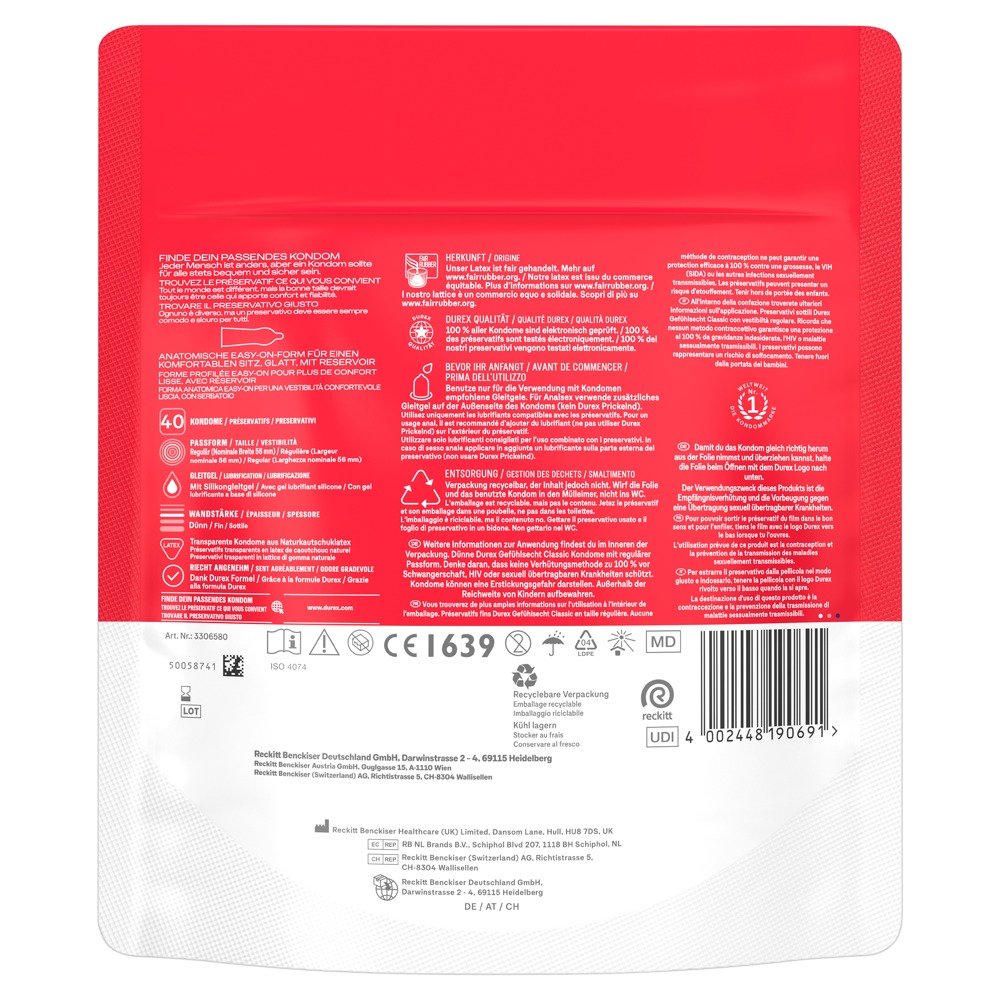 Préservatifs transparents Gefühlsecht Classic de Durex en latex de caoutchouc naturel avec enduction humide à base de silicone. Par rapport aux préservatifs cylindriques traditionnels, la forme anatomique innovante Easy-on des préservatifs Durex offre un peu plus de place aux bons endroits et garantit ainsi une mise en place et un déroulement plus faciles ainsi qu'une assise confortable et des sensations intenses.