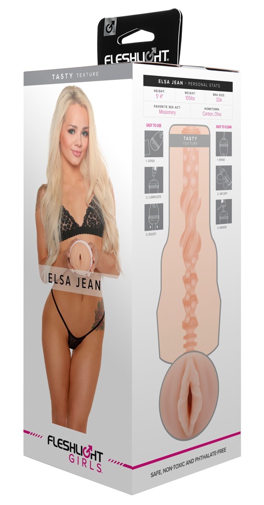 Elsa Jean Smaczny masturbator od Fleshlight o dyskretnym wyglądzie latarki z oryginalnie uformowanym otworem pochwy od gwiazdy erotycznej Elsy Jean. Bardzo zróżnicowane wnętrze o różnych średnicach jest również bardzo zbliżone do ciasnej pochwy Elsy i zapewnia intensywny, orgazmiczny masaż podczas ręcznej roboty. Wewnętrzny rękaw wykonany z super miękkiego materiału przypominającego skórę jest oznaczony autografem Elsy obok otworu i można go łatwo wyjąć z masturbatora w celu wyczyszczenia.