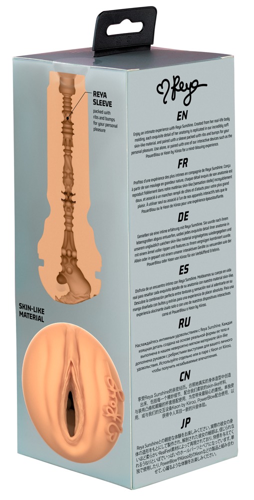 Feel Reya Sunshine masturbator fra Kiiroo med originalstøbt vulva af den erotiske stjerne Reya Sunshine. Det meget forskelligt strukturerede indre kommer også meget tæt på Reyas vagina og giver en intens massage under et handjob. Det indre sleeve af hudlignende blødt materiale er endda signeret med Reyas autograf ved siden af vulvalæberne. Sleevet kan nemt fjernes fra det skridsikre, diskrete hus for at blive rengjort.