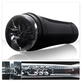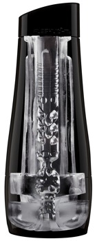 Transparent masturbator med noppet-rillet vagina lystkanal og stram anusåbning i en sort dåse. Glid blot ind i de stramme lystkanaler og oplev den pure ekstase.
