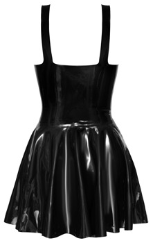 Enkel og smuk, tætsiddende minikjole fra LateX lavet af sort latex (tykkelse 0,35 mm). Hudtæt top med smalle stropper foroven og et bredt svingende skørt forneden.
