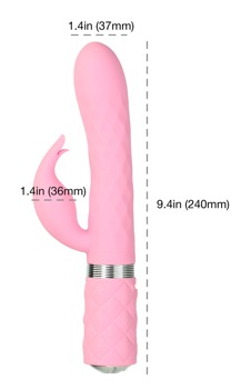 Le vibromasseur Lively rabbit de Pillow Talk, à double moteur et à la texture intense, se tortille et s'enfonce dans le vagin, massant intensément le point G. Parallèlement, le clitoris est choyé par les vibrations du stimulateur flexible à trois langues.