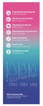 3 x anaalpluggen in de Anaal Training Kit Luster van ROMP in verschillende maten en trendy kleuren met een elegante metallic glans. Perfect voor rectale stimulatie en rektraining. Elke plug heeft een conisch gevormde, gladde top en een anaal veilige, hartvormige stop. Alle drie de anaalpluggen zijn aangenaam flexibel en gemaakt van zijdezachte siliconen voor eenvoudig inbrengen, optimale aanpassing en maximaal comfort. Ideaal voor anaal plezier beginners!