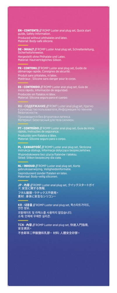 3 x korki analne w zestawie Anal Training Kit Luster od ROMP w różnych rozmiarach i modnych kolorach z eleganckim metalicznym połyskiem. Idealne do stymulacji odbytu i treningu rozciągania. Każdy stożkowy, gładki korek z wrażliwą końcówką i bezpiecznym dla odbytu korkiem w kształcie serca. Wszystkie trzy korki analne są przyjemnie elastyczne i wykonane z jedwabiście miękkiego silikonu dla łatwego wkładania, optymalnej regulacji i maksymalnego komfortu. Idealne dla początkujących miłośników zabawy analnej!