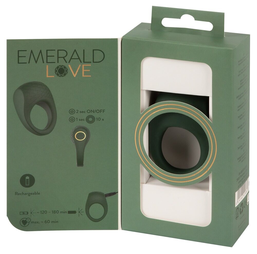 Ligeramente elástico Anillo de pene vibrante de Emerald Love con estimulador de clítoris/testículos en un noble diseño de diamantes. Favorece la erección gracias al efecto de éxtasis sanguíneo y proporciona una excitante estimulación adicional durante las relaciones sexuales con sus 10 modos de vibración pulsando un botón directamente en el juguete: directamente en el clítoris o en los testículos, dependiendo de cómo se lleve el anillo en el pene. También en la bañera o la ducha, ya que es resistente al agua. La textura de tacto suave y aterciopelado garantiza una gran comodidad de uso para una sensación muy agradable en la piel. Recargable: cable de carga USB incluido.
