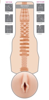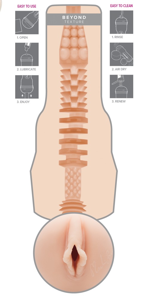 Madison Ivy Beyond er utstyrt med naturtro kopi av vagina til pornostjerna med samme navn. Masturbatoren er inni et perlemorsfarget hylster og ved siden av de kunstige skamleppene hennes finner du Madison Ivys signatur. Masturbatoren er laget av det utrolig naturtro materialet Superskin, og det føles som ekte hud. I tillegg er den utstyrt med nupper som gir intensiv stimulering.Total lengde/innføringsdybde 25 cm, tøyelig diameter.