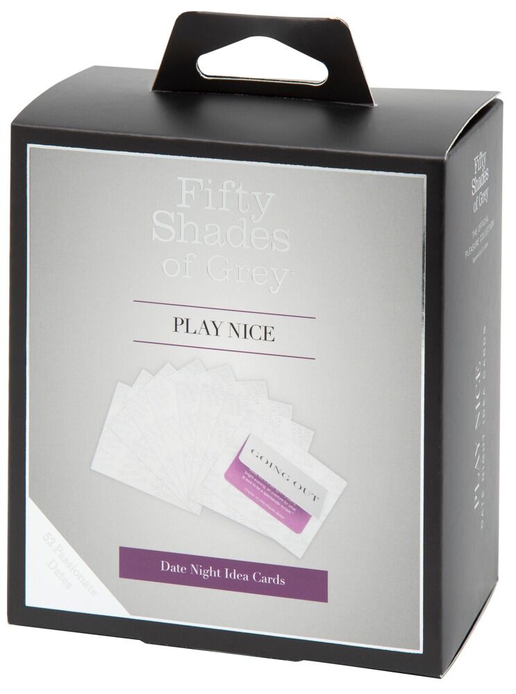 Kortspill Play Nice Date Night Idea Cards fra Fifty Shades of Grey i edel stil. Gir perfekt inspirasjon til intensivt romantiske og erotiske eventyr. 52 kort er oppdelt i 2 kategorier: Staying in (vi holder oss hjemme) m.feks. frokost på senga eller felles dusjing. Going Out (vi går ut) med f.eks. heit klining i heisen eller å se en solnedgang sammen. Det er bare å trekke et kort og bli inspirert og overrasket. Et kort per uke - nytelse og moro for et par i et helt år!