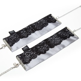 Eleganti polsini Play Nice in raso e pizzo di Fifty Shades of Grey con catena di collegamento a moschettone staccabile. I comodi polsini in raso color argento sono decorati con un delicato pizzo nero a ciglia e sono regolabili in circonferenza per adattarsi.