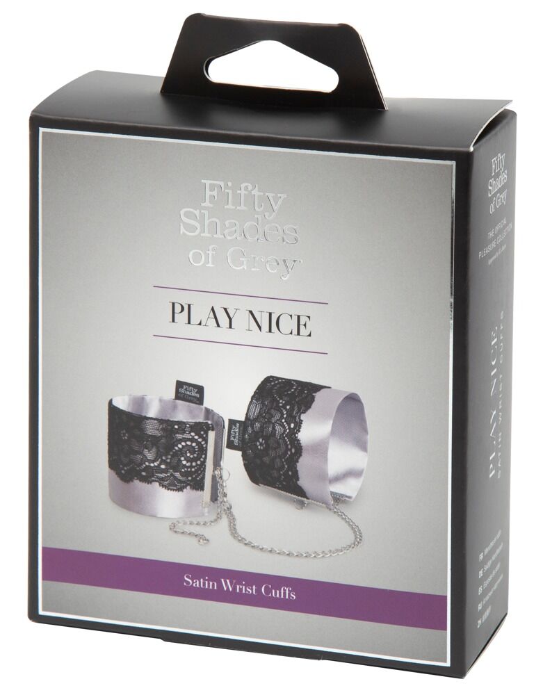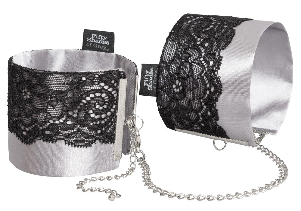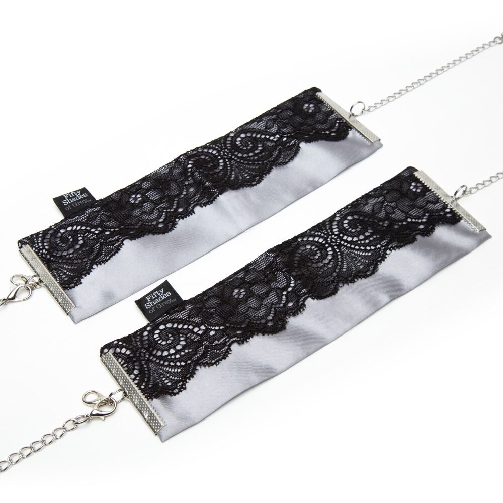 Eleganckie kajdanki Play Nice Satin & Lace Wrist Cuffs by Fifty Shades of Grey z odpinanym łańcuszkiem łączącym karabinek. Wygodne mankiety wykonane z satyny w kolorze srebrnym są ozdobione czarną delikatną koronką z rzęs i mają regulowany obwód, dzięki czemu można je dopasować.