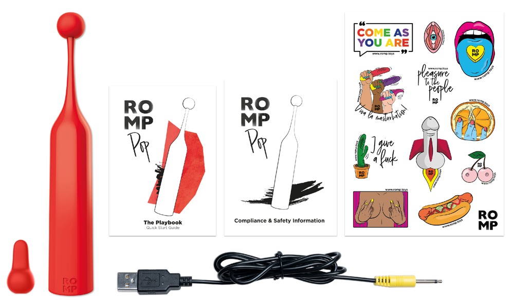 Pop minivibrator fra ROMP med 2 forskellige vedhæftede filer til præcis stimulering af alle eksterne fornøjelsespunkter, især klitoris. Den er handy, let og nem at bruge og kan indgå sensuelt i enhver solo- eller parleg. Og takket være dens vandtæthed kan den også tages med i badet eller brusebadet.