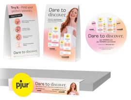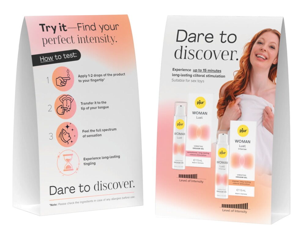 Advertise the new stimulation gels Woman Lust from Pjur now. 3-piece POS kit that contains: