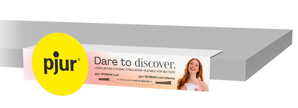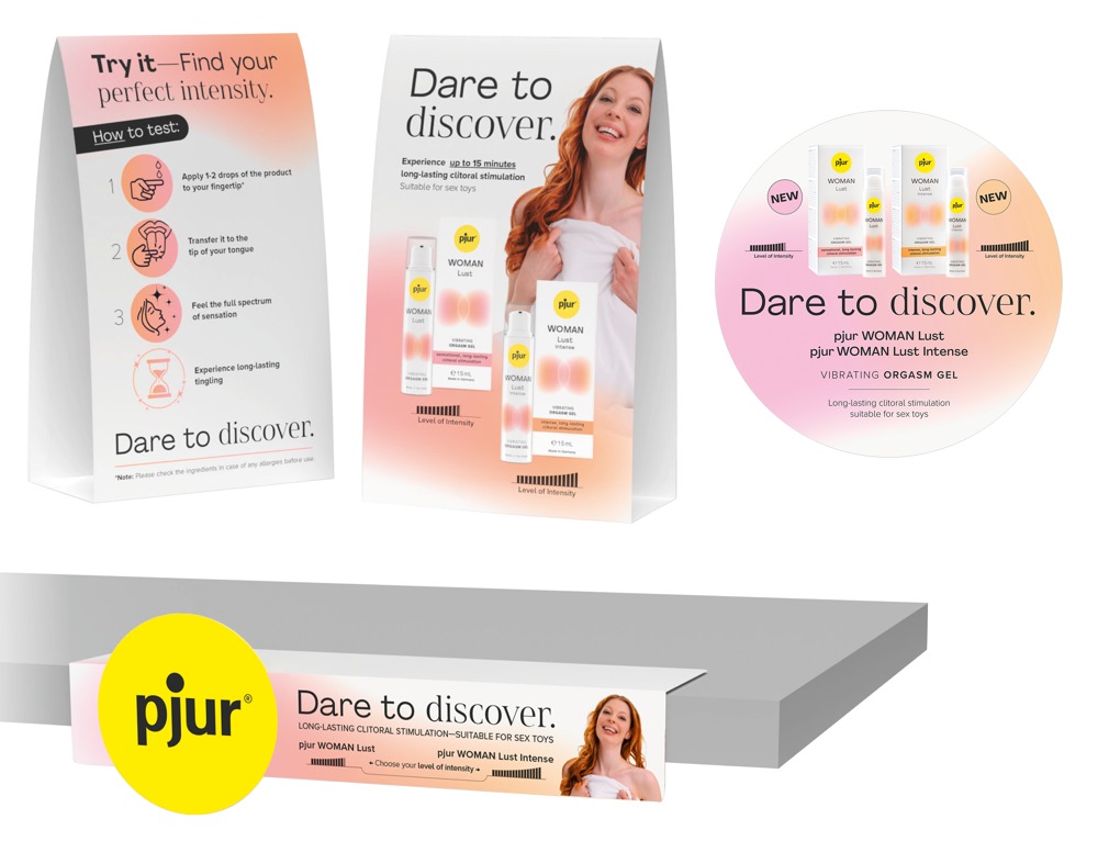 Jetzt auf die neuen Stimulationsgele Woman Lust von Pjur aufmerksam machen. 3-teiliges POS Kit bestehend aus: