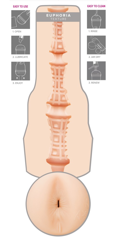 Masturbator Riley Reid Euphoria marki Fleshlight z oryginalnie wyprofilowanym otworem odbytu gwiazdy erotyki Riley Reid. Wnętrze o bardzo zróżnicowanej strukturze jest również bardzo zbliżone do ciasnego kanału analnego Riley i zapewnia intensywny, orgazmiczny masaż podczas pracy ręcznej. Wewnętrzny rękaw wykonany z przypominającego skórę, miękkiego materiału Superskin jest oznaczony autografem Riley obok otworu i można go łatwo wyjąć z poręcznego, dyskretnego pudełka z pokrywką do czyszczenia.