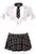 Cravate austère et minijupe oscillante à fermeture-éclair sur le côté, le top court étant à nouer devant et aux manches met en valeur la poitrine, culotte ouverte à l´entrejambe et sur une partie des fesses. Quadrillage multicolore. Top/culotte: 95% polyester, 5% élasthanne. Jupe/cravate: 100% polyester. Sans bas.