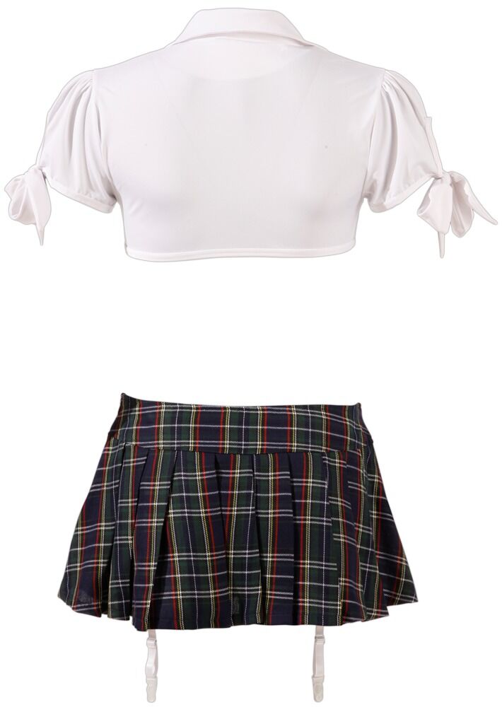 Strengt slips og vippende miniskjørt med glidelås i sida, kort topp foran, som knytes over brystene. Åpen truse med sexy glimt av rumpe. Rutete. Topp/truse: 95% polyester, 5% elastan. Skjørt/slips: 100% polyester. Uten strømper.