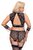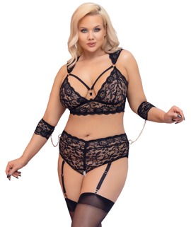 A bralette, crotchless suspender briefs and arm restraints in a set from Cottelli BONDAGE PLUS. All pieces are made out of soft and stretchy lace with rose-gold coloured details. The stretchy restraints with snap hook chains can be removed from the rings at either side of the briefs. The seductive bralette has stretchy straps and rings in the cleavage area and has an elaborate, open back. There is a hook fastener at the back and a small clip fastener at the back of the neck as well. The adjustable suspender straps can be removed from the crotchless briefs.