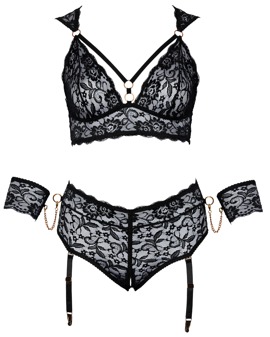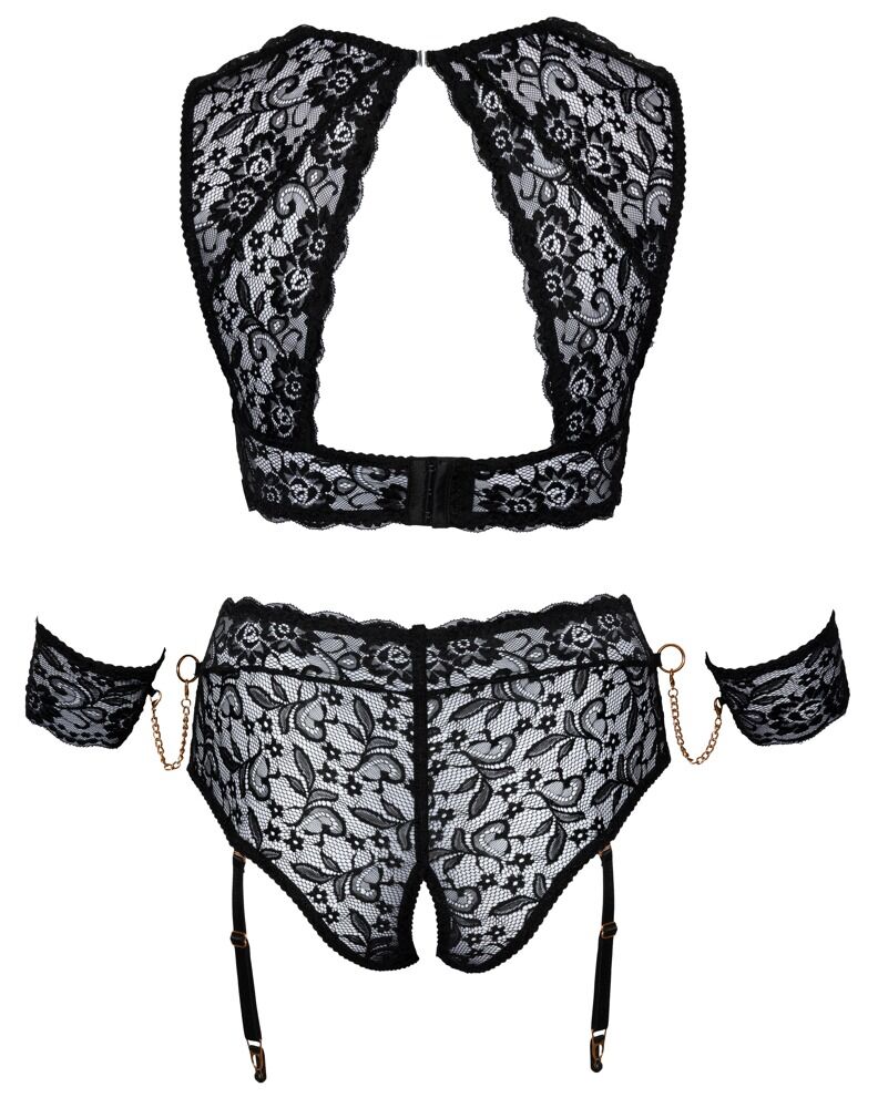 - Set: Bralette, crotchless suspender briefs and arm restraints