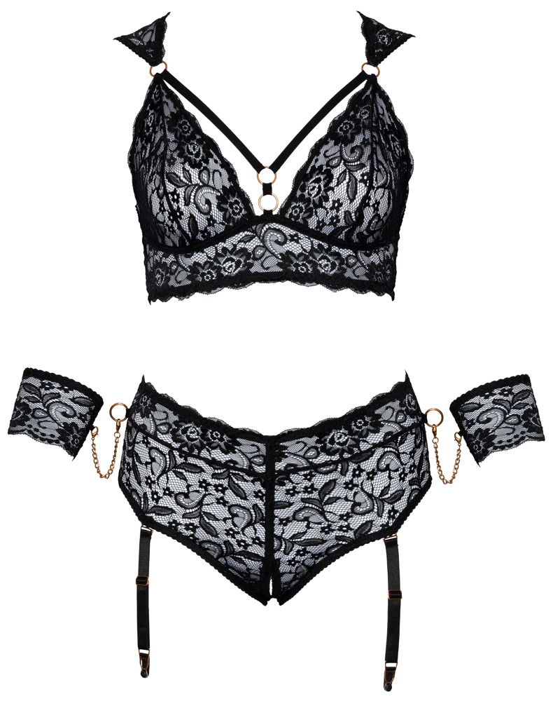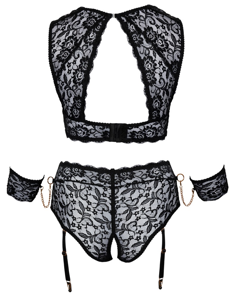 Bralette, öppen strumphållartrosa och armbojor i ett set från Cottelli BONDAGE PLUS av mjuk, elastisk spets med roséguldfärgade detaljer. Med elastiska armbojor med karbinkedjor som kan tas av trosan. Bralette med stretchband och ringar i urringningen. Med hakknäppning baktill och en liten clipförslutning i nacken. Strumphållartrosan är öppen i grenen, de justerbara strumphållarna kan tas av från trosan.