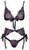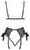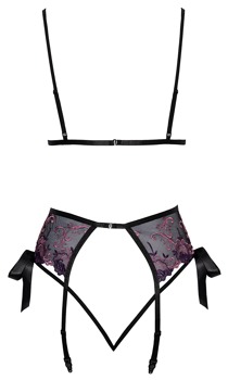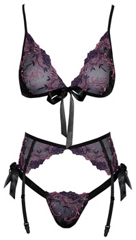 Miękki biustonosz, pas do pończoch & stringi w komplecie kissable całkowicie wykonane z delikatnego czarnego powernetu z misternym kwiatowym haftem w kolorze różu i fioletu. Miękkie i elastyczne dookoła dla najwyższego komfortu noszenia. Miękki biustonosz z przodu i stringi, z których każde posiada figlarną satynową kokardkę z boku. Biustonosz z zapięciem na zatrzask z tyłu, ramiączka są regulowane w celu dopasowania. Pas z zapięciem na haczyk z tyłu i regulowanymi szelkami. Małe stringi uwodzą dwoma wąskimi, elastycznymi paskami, które łączą się w kroku.