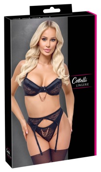 Bh med bøjle, hofteholder og g-streng kombineret i et sort sæt fra Cottelli LINGERIE. Alt sammen fremstillet af fine, bløde stretchblonder og elastisk satin. Bh'en og g-strengen har en rosaguldfarvet kædekant foran, som også kan tages af. Bh-stropperne og hægtelukningen bagpå kan justeres, så de passer. Ligesom hægtelukningen bag på hofteholderbæltet og hofteholderstropperne.
