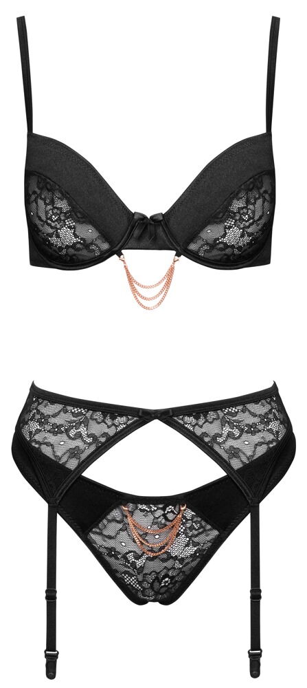 Bygelbehå, höfthållare och riostring kombinerat i ett svart set från Cottelli LINGERIE. Alla delar av fin mjuk stretchspets och elastisk satin. Behå och string med roséguldfärgat kedjepynt framtill. Kedjepyntet kan tas av. Axelbanden och hakknäppningen kan justeras. Likaså som hakknäppningen till höfthållaren och strumphållarna.