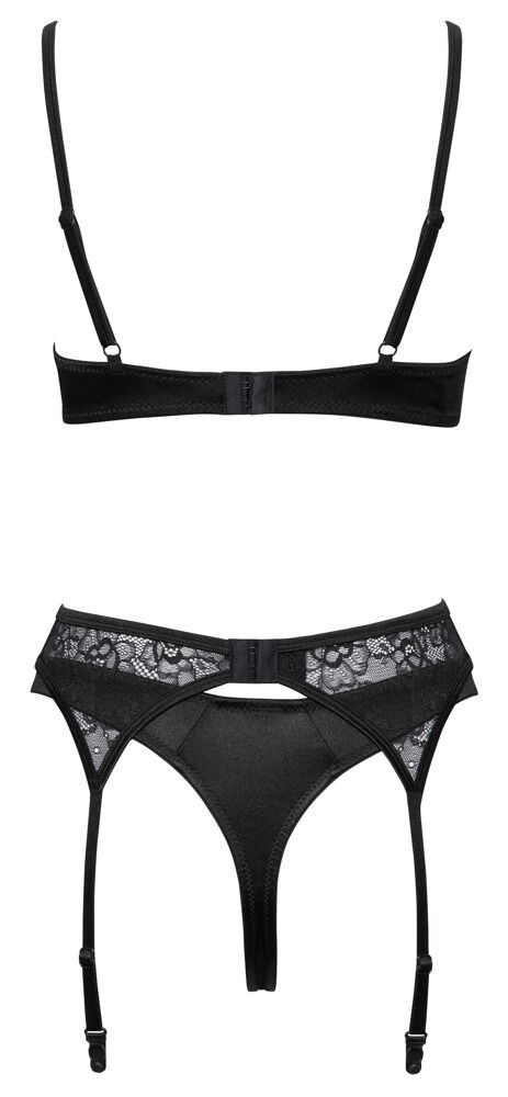 Reggiseno con ferretto, reggicalze e perizoma combinati in un set nero di Cottelli LINGERIE. Tutti realizzati in pregiato e morbido pizzo elasticizzato e raso elasticizzato. Il reggiseno e il perizoma hanno una catena color oro rosa sul davanti, che può anche essere rimossa. Le spalline del reggiseno e la chiusura a gancetto sulla schiena possono essere regolate a piacere. Così come la chiusura a gancio sul retro del reggicalze e delle bretelle.