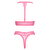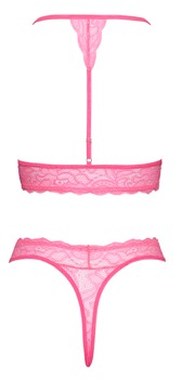 The lingerie set from Cottelli FANTASY is made up of a wireless bra and thong. Made entirely out of delicate neon pink lace. The set is soft and stretchy. The halterneck bra with has stretchy straps attached to the wireless cups. There is a lace insert and an adjustable strap at the back.