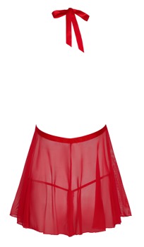 Kort, udringet babydoll fra kissable i rød transparens lavet af smukke blomsterblonder (top) og fint powernet (nederdel). Silkeblød og elastisk for høj bærekomfort. Fortil med en generøs halsudskæring fra halterneck til taljebånd. Satinbåndet i halterneck bindes i nakken, satinbåndet i taljen bindes foran. Ryggen fri. Den matchende lille blondeg-streng er inkluderet.
