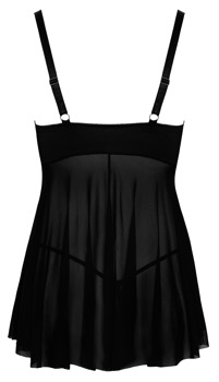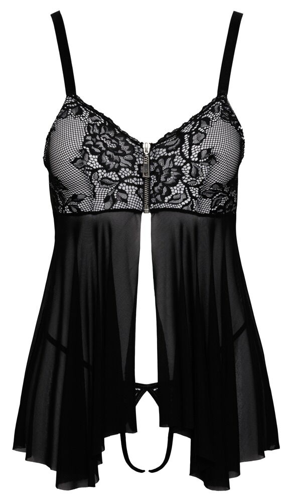 Kort, udringet babydoll og skridtfri g-streng fra Cottelli LINGERIE. Babydoll lavet af blødt, elastisk powernet. Helt åben foran med lynlås i fuld længde mellem de hvide skåle, der er dækket af fine sorte blonder. Stropperne er justerbare, så de passer. Den elastiske g-streng med stropper forfører med sit åbne skridt.