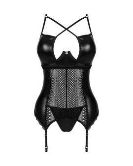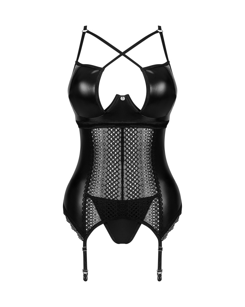 Strumphållarcorsage och string i settet Norides från Obsessive. I ädel wetlook som är elastiskt och mjukt. Fina spetsinsatser och spetsdetaljer. Bygelkupor i en snygg stil med rem och extravagant urringning. Baktill med justerbar snörning. Axelbanden, hakknäppningen i den djupa ryggskärningen och strumphållarna kan också justeras. Wetlookstringen har en liten spetstrekant på rumpan.