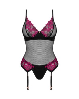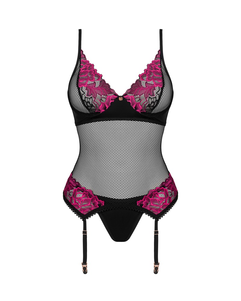 Elegante set Rosenty di Obsessive con reggicalze e perizoma. Morbida rete nera elasticizzata con sottile pizzo rosa sul décolleté e sui fianchi. Reggicalze con piccolo elemento decorativo tra le coppe con ferretto e chiusura a gancio regolabile nella scollatura posteriore. Anche le spalline e il reggicalze sono regolabili. Viene fornito con un reggiseno opaco abbinato.