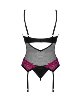 Elegant sett Rosenty fra Obsessive med korselett og strengtruse. Mykt, svart nettingstoff med edel rosa roseblonde på skåler og benkant. Lite pynteelement mellom skålene og hektelukking bak. Dypt nedringet bak. Justerbare skulder- og strømpestropper. Dertil matchende strengtruse i ugjennomsiktig stoff.