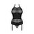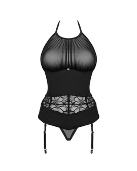 Suspender shirt and thong in the black Serafia set by Obsessive. Suspender shirt in a sophisticated material mix with delicate tulle over the bust and lace at the front and back. Elasticated and soft all over for a high level of comfort. With integrated vertical moulded boning for a perfect figure-hugging fit. The halterneck and hook fastening at the back can also be adjusted to suit. Just like the suspender straps, which can also be removed completely.