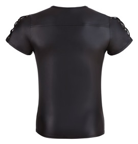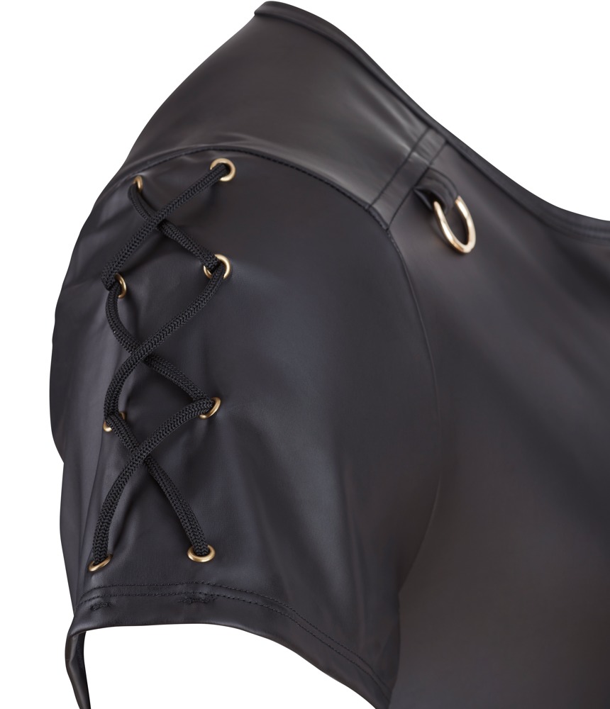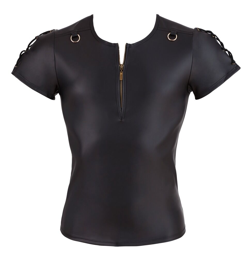 A straight cut shirt made out of beautiful, black, matte look material with a short brass zip at the front. With D-rings on the shoulders and striking lacing on the sleeves. Wonderfully stretchy for a perfect fit.