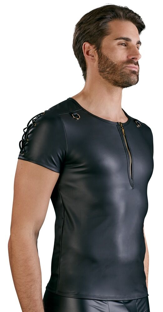 Gerade geschnittenes Shirt im edlen, schwarzen Mattlook mit kurzem Messing-Reißverschluss vorne. An der Schulterpartie mit D-Ringen, auf den Ärmeln markante Schnürungen. Fantastisch elastisch für optimale Passform. 90% Polyester, 10% Elasthan, Beschichtung Polyurethan.