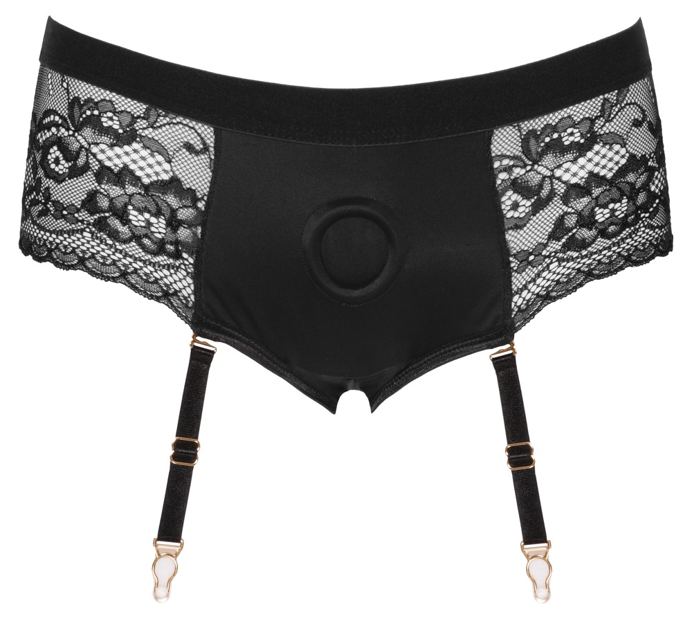 Schwarze Strap-on-Panties von Bad Kitty im weichen elastischen Material-Mix aus Mikrofaser und Spitze. Vorne doppellagig mit Einschub gearbeitet und mit sorgfältig eingearbeitetem Stretch-Haltering (Ø 3,5 cm) zum Einsetzen eines Dildo/Vibrators mit Stand-/Saugfuß. Über dem Po mit einladendem Cut-out. Die Strumpfhalter sind verstell- und auch komplett abnehmbar.