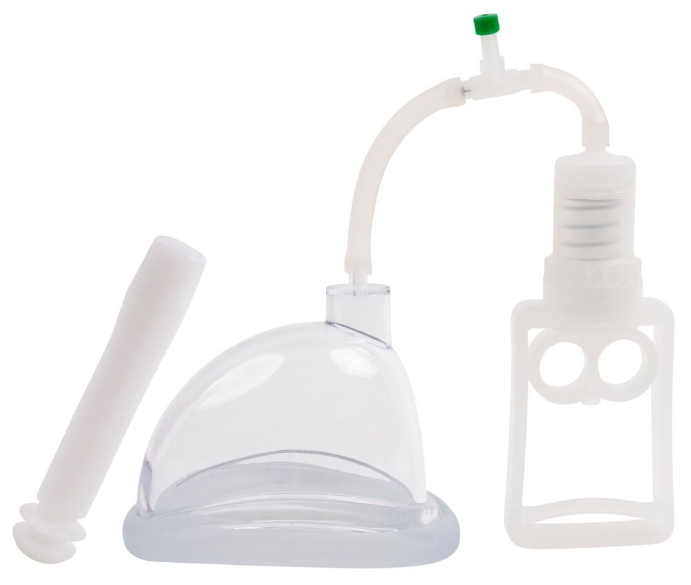 Glasklar, fast intimsugskål med passande stickmanschett. Med en kolvhandtagspump inklusive slang och ventil som skapar ett vakuum upp till 600 Mbar. Inklusive införingssond som ger en extra lustökning.