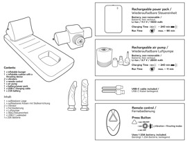 Includes 1 x inflatable bed with a backrest, 1 x inflatable part with a thruster and a comfortable leg rest, 1 x rechargeable control unit, 1 x rechargeable air pump, 1 x USB-C cable, 1 x remote control including a battery (23A), 2 x vibrator.