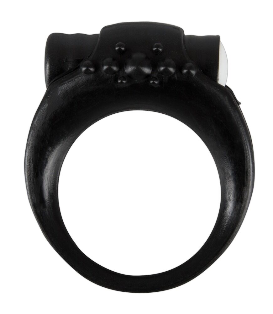 Czarny pierścień na penisa ciasno owija się wokół penisa, podczas gdy dołączony wyjmowany mini wibrator (przycisk ON/OFF) stymuluje. Ø 3,2 cm (bardzo rozciągliwy). Materiał: silikon, ABS (kula). Zawiera baterie guzikowe.