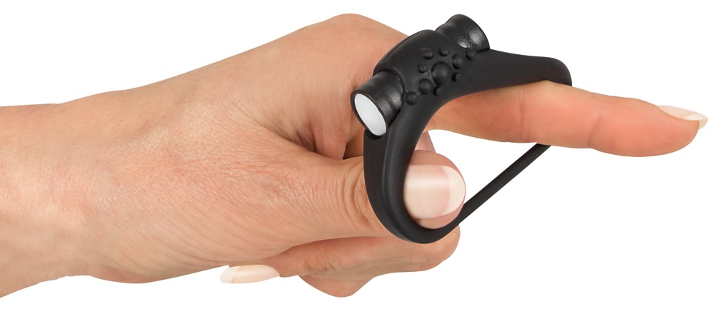 Den sorte penisring omslutter lemmet tæt, mens den medfølgende, udtagelige mini-vibrator (ON / OFF-knap) stimulerer.