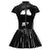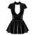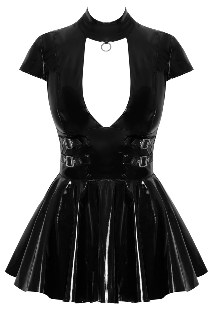 The mini dress from Black Level is made entirely out of shiny black vinyl. It is in a tight-fitting tapered fit and has a flared skirt part. It also has short sleeves and a stand-up collar with a (restraint) ring attached at the front. There is a large cut-out in the cleavage area as well. There are two waist straps with two buckles at either side for adjusting them. There is also a full-length zip at the back.
