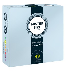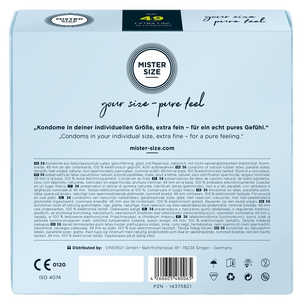 Transparent, extremely thin Mister Size condoms (49 mm) made out of natural rubber latex. The condoms are covered in lubricant and are teat-ended. Vegan.