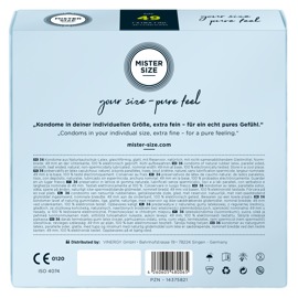 Прозрачные, тонкие презервативы Mister Size (49 мм) из натурального каучукового латекса с лубрикантом и резервуаром. Веганские.