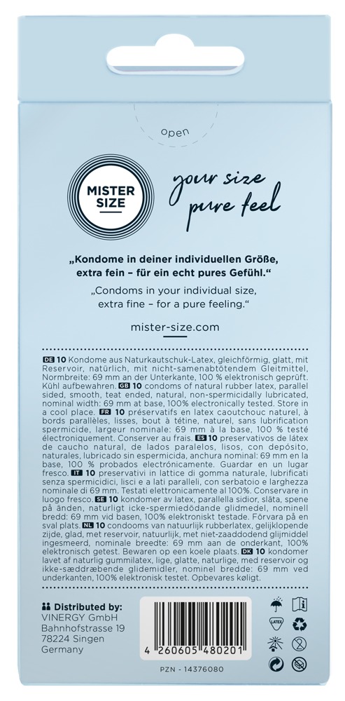 Transparent, extremely thin Mister Size condoms (69 mm) made out of natural rubber latex. The condoms are covered in lubricant and are teat-ended. Vegan.