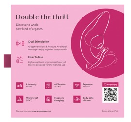 2 motors provide quiet, reliable power for dual stimulation. They can be controlled separately (at the push of a button) for individual pleasure. The pulsator stimulates the clitoris with 8 intensity levels. There are 3 vibration modes in 3 intensities for G-spot pleasure. The Womanizer BLEND can even be used in the bath because it is waterproof.