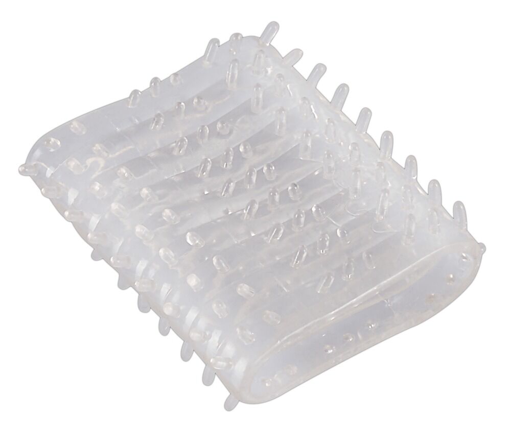 2. Penis sleeve with stimulating dots and grooves. 7 cm long, inner Ø 3.3 cm (very flexible).