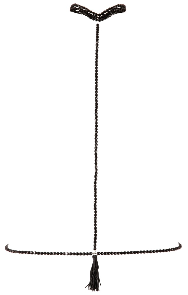 Elastisk, tre-raders perlekjede til halsen - gjennom et annet kjede forbundet med bikinikjedet, som lukkes bak med en liten karabinkrok. Liten frynsedusk på magen. Svart.