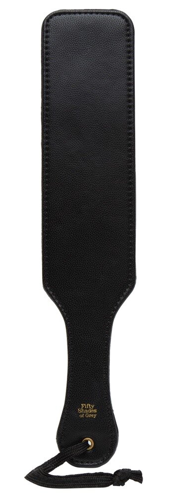 Elegant slagsmekker Bound to You Paddle fra Fifty Shades of Grey med ulike slagsider som gir muligheter for både myk og røff behandling. Ei side er i myk velur (kjærtegn) og den andre sida er i stilig, glatt jukselær (slag). Med løkke til hånd.