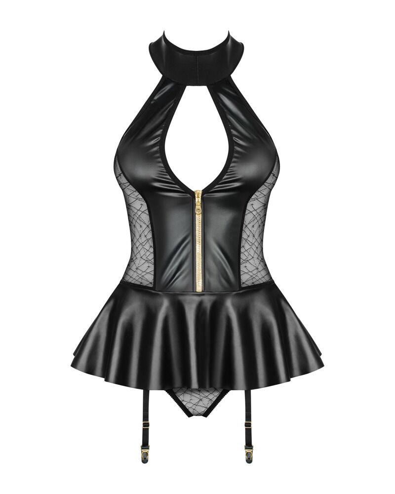 Strapskleidchen und dazu passender Slip im schwarzen Set 859-COR-1 von Obsessive. Edler Wetlook im Mix mit filigran gemustertem Stretchtüll. Weich und elastisch für vollen Komfort. Strapskleidchen mit ausgestelltem Schößchen, Reißverschluss vorne und variabler Schnürung hinten. Rückenfrei – Neckholder mit Klettverschluss. Die verstellbaren Strumpfhalter sind abnehmbar.