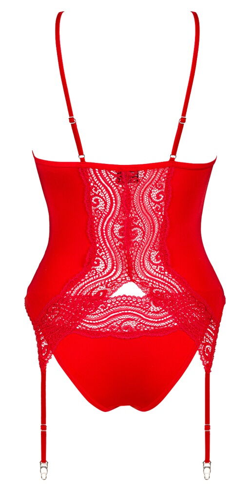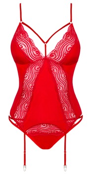 Ettersittende korselett og truse i sett Diyosa fra Obsessive i mykt stretchy stoff med blondemønstrede innsatser. Pyntestropper over skålene. Justerbare skulder- og strømpestropper. Matchende strengtruse med stretchstropper som linning foran.